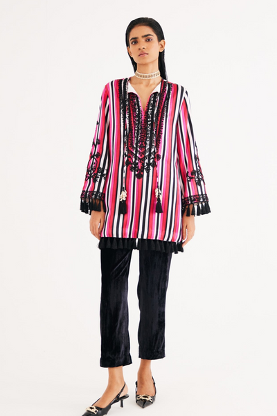 Rani Pink Stripe Mashroo Satin Embroidered Tunic and Black Narrow Pants Set