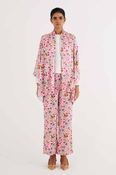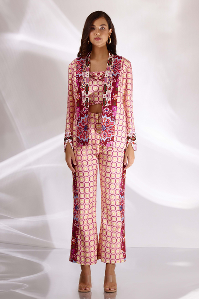 Pink Kashan Print Silk Jacket, Bustier & Pants Set