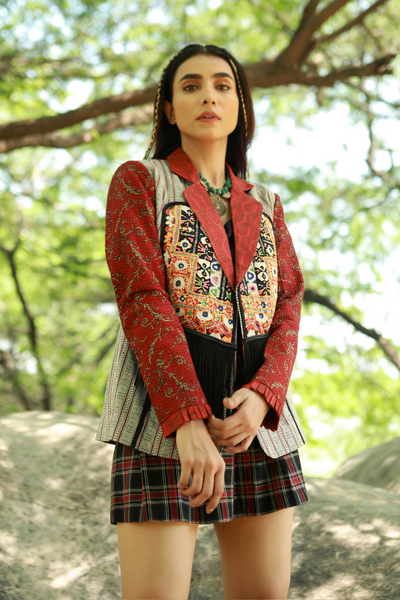 Kashan White And Red Print Hand Embroidered Biker Jacket In Handloom Organic Cotton And Banana Silk