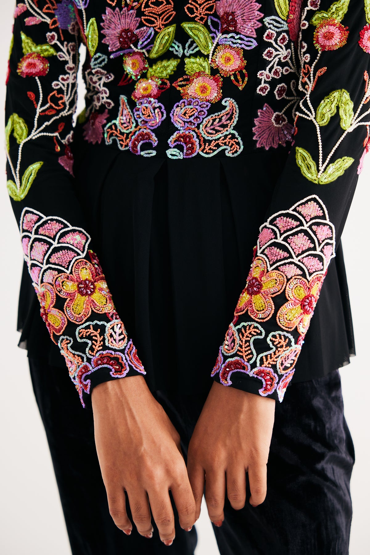 This a fit and flared net top with intricate hand embroidery. The colour scheme is mixed colour scheme which is perfect to blend with any occasion. This statement piece is versatile and head turner, and will uplift your wardrobe.