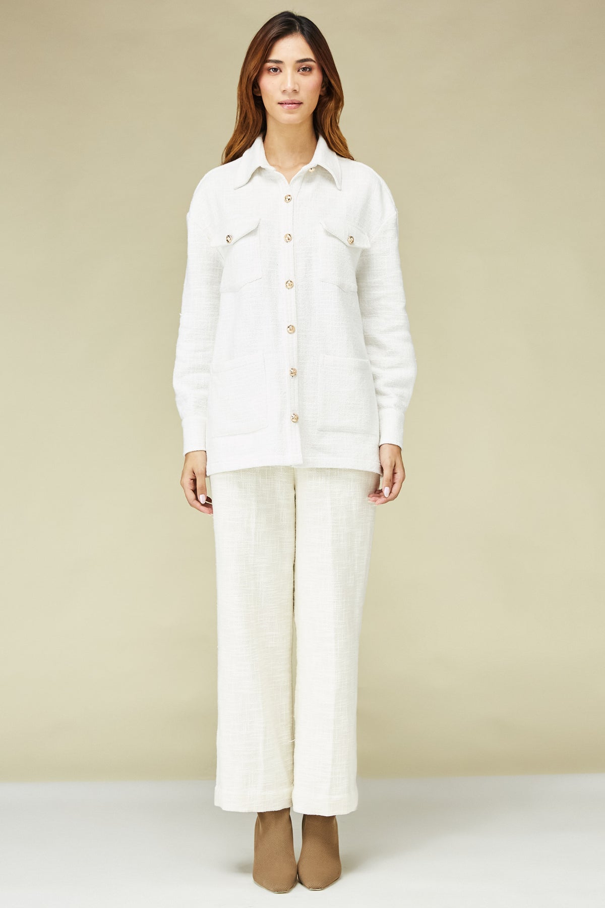 Discover timeless elegance with our White Handloom Tweed Safari Shirt. This shirt exemplifies classic safari style with a contemporary twist, handwoven to perfection. Its crisp white hue adds a touch of sophistication to your look, style it with our White Handloom Pants or with any other trouser. Embrace the spirit of exploration and refinement with this exceptional handloom creation.