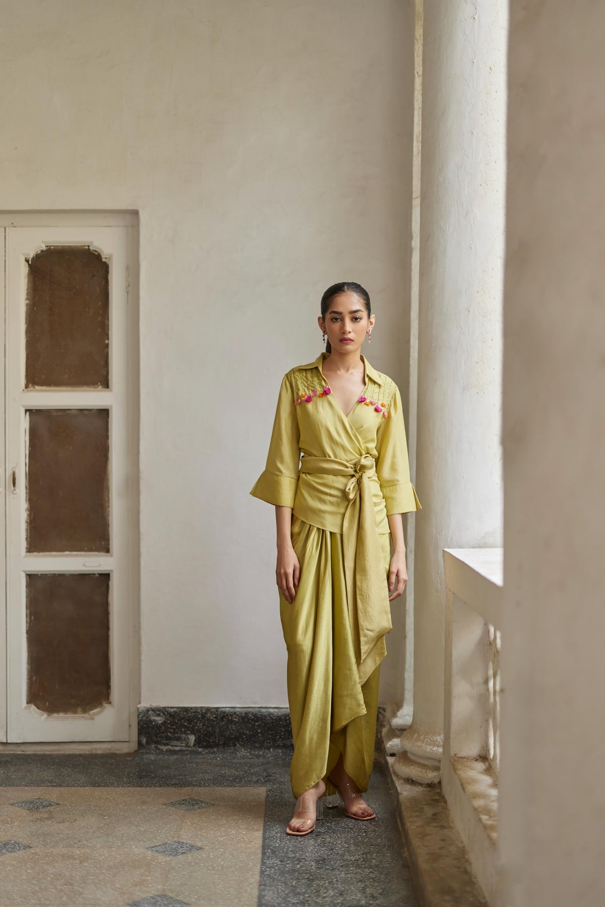 Wrap shirt in olive green Habotai silk fabric with light cotton voile lining