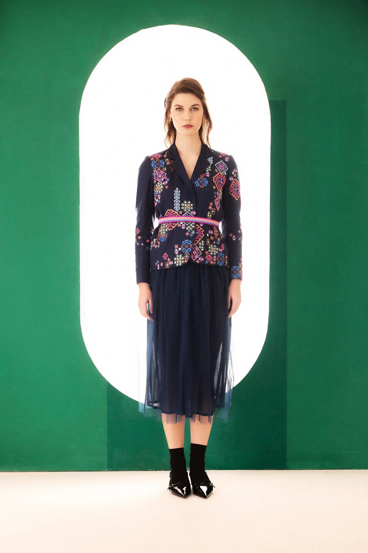 Colour: Navy Blue Material: Cotton satin fabric Style: Versatile and Classic Silhouette: Tailored Jacket Pairing: Pair it with BETRUE Midnight blue net romantic skirt for a complete look.