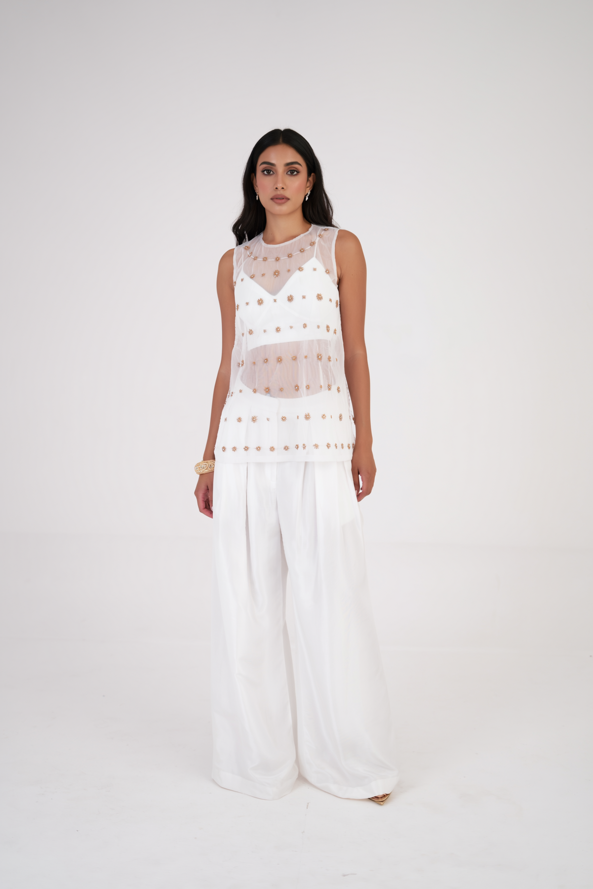Delicate, dreamy, and undeniably elegant — the Golden Ivory Embroidered Top by BETRUE is a statement in refined craftsmanship and modern femininity. Crafted from high-quality net fabric and adorned with intricate hand embroidery, this piece strikes the perfect balance between timeless elegance and contemporary styling.